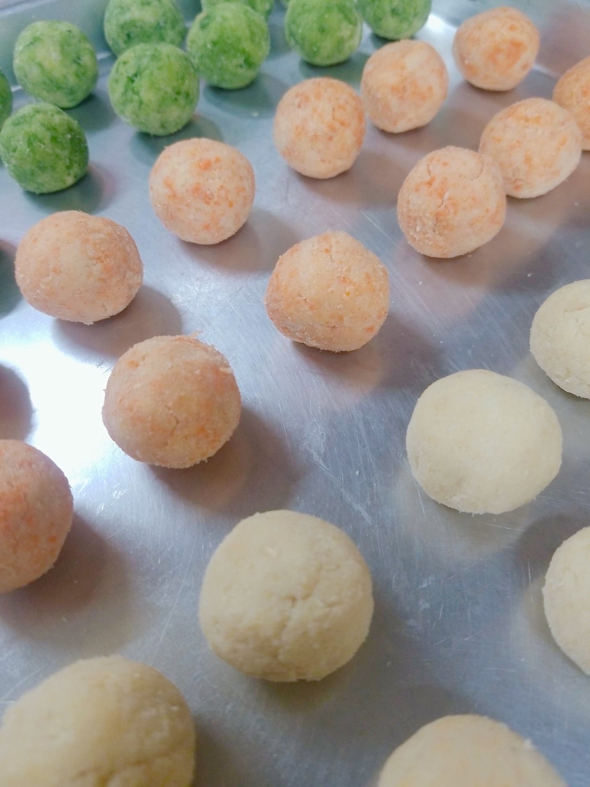 食べやすいように一口サイズに丸めたドーナツは中に十勝産の人参、さつまいも、ほうれん草をパウダーにしたものをを練りこんでいます。シナモン風味のかぼちゃジャムをつけて食べてもおいしく召し上がれますよ!